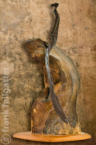 Diese kleine Skulptur besteht aus Stahl und Holz. Das Eisen wurde im Laufe der Jahre nach und nach von einer Berliner Straßenbahnschiene abgespalten und davor tausendmal von zentnerschweren Straßenbahnrädern gestreift. Das Holz begegnete mir bei strömendem Regen im Leipziger Clara-Zetkin-Park. Es ragte ein wenig aus dem matschigen Boden, gerade genug, um Assoziationen und Neugier zu wecken. Ich rechnete mit einer morschen Wurzel. Eines besseren belehrt, kauerte ich bald darauf im Matsch und zerrte wie ein apokalyptischer Troll an einem keineswegs morschen Eichenstubben. Es hat sich unbedingt gelohnt.