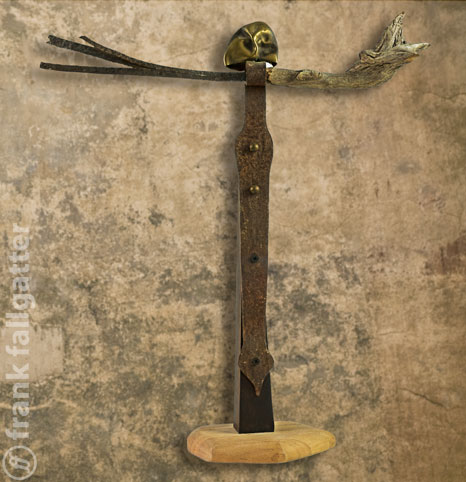 Eine Türangel, ein überfahrenes Stück Messing, ein ebenfalls überfahrenes Stahlblech und eine trockene Wurzel. Fertig. Die Gestalt mit ausgebreiteten Armen. Nein, Jesus ist es nicht.